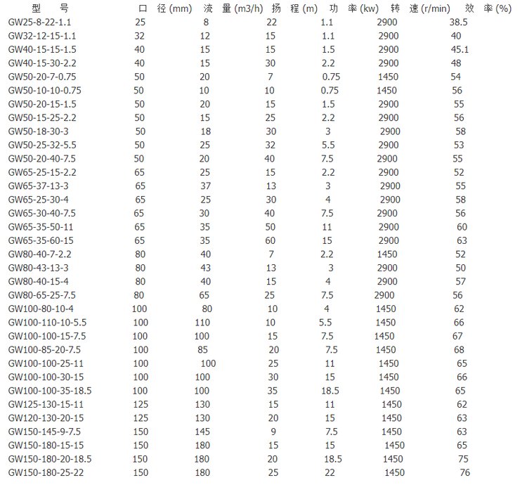 GW高(gāo)效管道(dào)排污泵性能(néng)參數(shù)  |